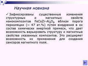 Низкая коэрцитивность наряду с высокой намагниченностью насыщения, значительной анизотропией поля в плоскости образца, высокое удельное сопротивление и гигантское положительное или туннельное отрицательное магнитосопротивление обусловили применение этих нанокомпозиционных материалов для конструирования различных магнитоэлектрических устройств с целью создания запоминающей среды со сверхвысокой плотностью магнитной записи, экранирования СВЧ и радиочастот и т.п.