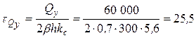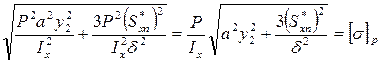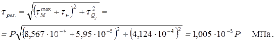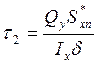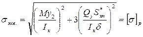 В т. 2 действуют нормальные напряжения от изгибающего момента, величина которых несколько ниже, чем в т. 1, однако в т. 2 действуют еще касательные напряжения от поперечной нагрузки, определяемые по формуле Журавского. Прочность в т. 2 оцениваем по эквивалентным напряжениям: