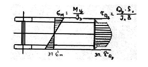 Эпюры напряжений от перечисленных нагрузок в расчетном сечении швов №2 будут иметь следующий вид: