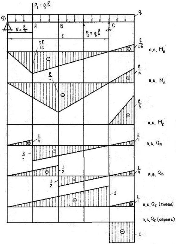С помощью линий влияния определить изгибающий момент и поперечную нагрузку в сечениях A, B и C балки.