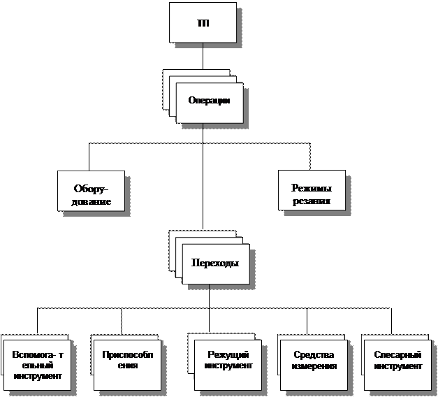 На первом уровне моделирования расположен объект, определяющий общие для ТП параметры: обозначение детали, имя разработчика и т. д. На втором уровне располагаются объекты, которые описывают операции, составляющие данных техпроцесс. Последовательность объектов определяет маршрут обработки данной детали. Составные части операции, такие как оборудование, приспособление, переходы, также являются объектами и располагаются на третьем уровне нашей структуры. И, наконец, на четвертом уровне расположены составные части переходов: инструменты, системы инструментов, режимы резания.