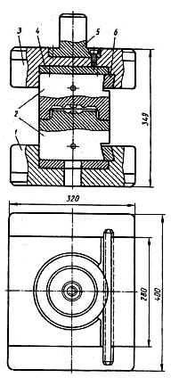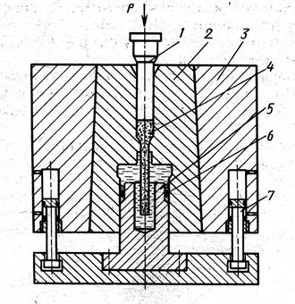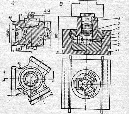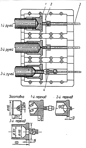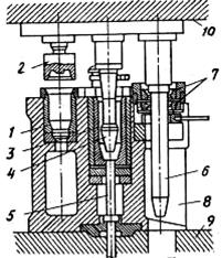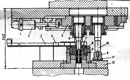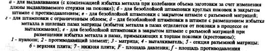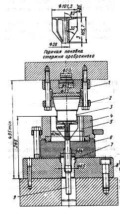 Пуансон 7 закрепляют в державке 8. Направление его обеспечивает цилиндрический выступ верхней полуматрицы. При поднятом положении верхней поперечины пуансон выходит из отверстия матрицы и таким образом открывается доступ для загрузки штампа заготовкой. Последняя имеет форму усеченного конуса длиной 360 мм с верхним диаметром 230 мм и нижним 150 мм. После штамповки выбивают клинья 6 и при обратном ходе поперечины пресса, используя последнюю, поднимают плиту 5 вместе с полуматрицей 4, извлекают поковку и выжимают из нее боковые пуансоны 3.