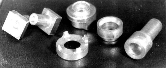 Высокими пластическими, технологическими свойствами, коррозионной стойкостью, хорошей свариваемостью обладают технический алюминий и термически неупрочняемые сплавы алюминия с марганцем и магнием (АД00, АД0, АМц, АМг и др.) Высокой технологичностью при обработке давлением обладают сплавы системы Al-Mg-Si. Это сплавы марки АД31, АДЗЗ, АД35. Сплавы хорошо поддаются прессованию при больших скоростях деформирования, а также штамповке в холодном и горячем состоянии. Из них получают профили и поковки различной конфигурации. Они хорошо подвергаются цветному анодированию. Однако, сплавы типа АД31 имеют не высокие прочностные характеристики (см. приложение № 1). На рис. 3 представлены детали пневмоаппаратуры (Æ 40 - 65), полученные холодной объемной штамповкой на прессе К0032 (160 тс) из сплава АДЗ1. Сплавы системы Al-Zn-Mg также обладают высокой технологичностью. Так, например, из сплава типа 1925 изготавливают детали прессформ.