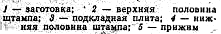 Сборку штампа осуществляют следующим образом. В гнездо нижней плиты 1 помещают нижнюю полуматрицу 2, в пазы которой закладывают хвостовики боковых пуансонов 3. Далее устанавливают верхнюю полуматрицу 4 и прижимную плиту 5, которую скрепляют клиньями 6 с нижней плитой 1.
