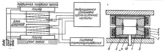 Принципиальная схема штампового блока изотермической штамповки показана на рис. 42. Нижний 16 и верхний 13 штампы прикрепляются с помощью шпилек 6,7 соответственно к штамподержателем 4 и 10, связанным через теплоизолирующие прокладки 2 и 11с опорными плитами 1 и 12. Теплоизоляция штампового блока состоит из прокладок 2 и 11 и нижнего неподвижного 3 и верхнего подвижного 9 кожухов. При перемещении ползуна пресса вверх кожух 9 не выходит из кожуха 3, что предотвращает нарушение теплоизоляции рабочей зоны. Штампы нагревают индукторами 5, 8. Заготовки 14 загружают, а штампованные поковки удаляют через специальное окно 15 в кожухе 3. Конструкция штампового блока позволяет нагревать инструмент до температуры деформации с минимальными затратами энергии.