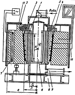 Водоохлаждаемые индукторы 5 и 8 из медной трубки имеют межвитковую изоляцию. К индукторам подводится ток через понижающие трансформаторы.