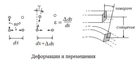 Изменения положения материальных частиц количественно оценивается "деформациями" (линейными и угловыми), а соответствующие силы сопротивления "напряжениями" (нормальными и касательными). Связи между ними подчиняются физическим законам. При малых геометрических изменениях форм и размеров эти связи практически линейные и выражаются законом Гука. Изменение положения поперечных сечений стержня характеризуются "перемещениями" (линейными и угловыми), а суммарное (интегральное) значение сил сопротивления всех материальных точек в сечении "внутренними силовыми факторами".