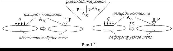 " предполагает, что взаимодействие происходит в точке или по линии, то есть по поверхности с площадью равной нулю. Это предположение имеет смысл, если взаимодействующие тела являются "абсолютно" твёрдыми. Для них распределённые по поверхности силы можно определить равнодействующей силой сосредоточенной в одной точке (рис.1.1). Именно таким образом представляются силы в "Теоретической механике", где изучается движение тел и условия их равновесия, когда изменение форм и размеров тел является несущественным.
