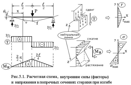 Так, для изгибаемого стержня действие распределённых сил и сосредоточенных проявляется в том, что его поперечные сечения перемещаются по вертикали и поворачиваются, ось искривляется. В поперечных сечениях возникают внутренние силы.