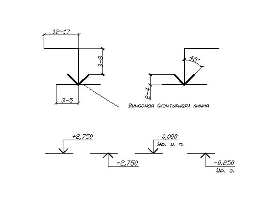 – это расстояние по высоте от нулевого уровня. Измеряется в метрах с тремя десятичными знаками после запятой. Все элементы, расположенные ниже уровня пола 1-го этажа (подвальные помещения, фундаменты и т.д.), имеют отметку со знаком минус, а выше уровня пола 1-го этажа – со знаком плюс. При необходимости отметки сопровождаются соответствующими надписями: Ур.ч.п. – уровень чистого пола, Ур.з. – уровень земли.