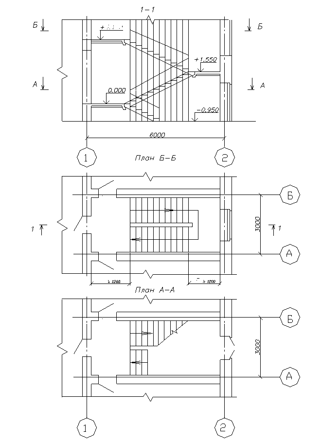 На рис.16 показан пример разбивки двухмаршевой лестницы в здании с высотой этажа Н =3.1 м. Высота каждого марша равна Н/2=1.55 м. Количество подступенков в одном марше равно 1550/155=10.