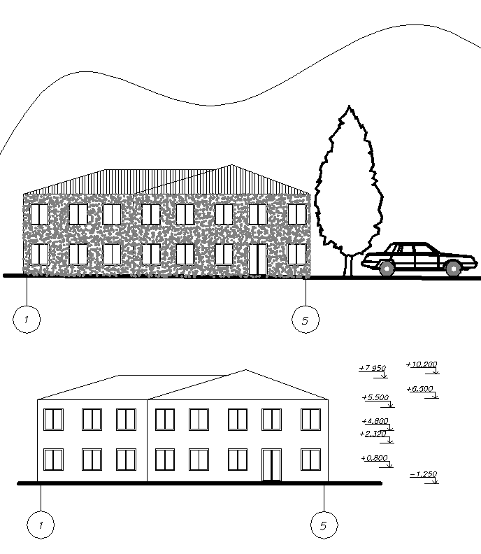 . Фасад может быть торцевым или дворовым. Над фасадом дается соответствующая надпись типа «Фасад 1-6» в соответствии с крайними осями слева направо (см. рис.19.) Фасад должен быть простым и красивым. В некоторых случаях на чертеже может быть показана фактура стен (материал, из которого сделана отделка стен).