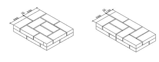 2. Вычерчивают контуры наружных и внутренних несущих стен и колонн (если они имеются). При этом оси проходят по контуру стены, либо смещены внутрь стены на 100 мм, либо проходят посередине стены. Наружные и внутренние несущие стены имеют толщину в 2 или 1,5 кирпича соответственно. Это означает, что 2 или 1,5 кирпича (по длине) укладываются поперек стены (см. рис.7,8)