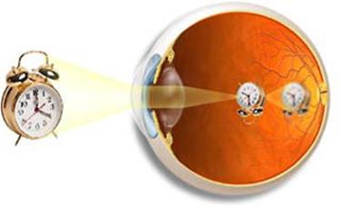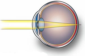 При дальнозоркости или гиперметропии фокус оптической системы глаза (формирование наилучшего изображения) находится позади сетчатки. Такую рефракцию называют еще слабой рефракцией по отношению к данному глазу. Т.е рефракция маловата относительно переднезаднего размера глаза.