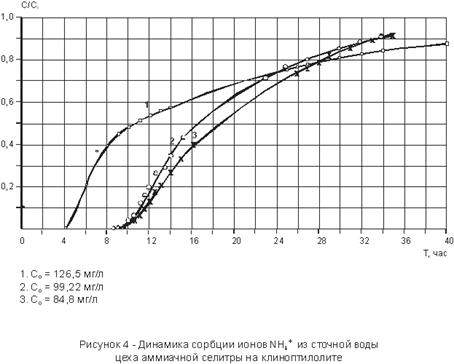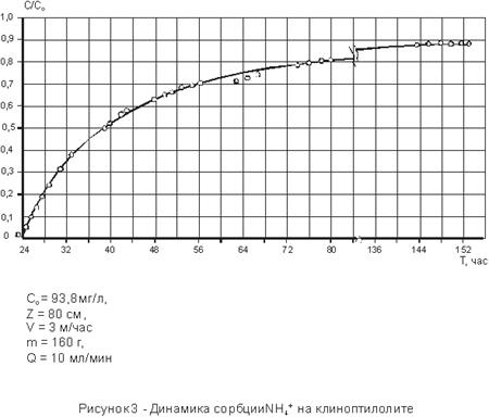 Рассчитана полная сорбционная емкость клиноптилолита в динамических условиях, которая для модельного раствора составила , для сточной воды .