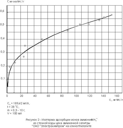 Получены изотермы адсорбции ионов аммония на клиноптилолите. Максимальная величина адсорбции составляет: - для модельных растворов и - для сточных вод. На рисунках 1, 2 представлены изотермы адсорбции ионов аммония из растворов хлористого аммония и сточных вод цеха аммиачной селитры на клиноптилолите в координатах: