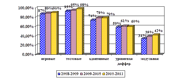 В школе создаются условия, благоприятствующие инновационным процессам и вовлечению широкого круга учителей в поисковую творческую деятельность. Сформировано позитивное отношение у учителей к непрерывному психолого – педагогическому образованию и самообразованию. Достаточно эффективно в 2010 – 2011 у.г. использовалась дистанционная форма повышения квалификации педагогов. Такая форма обучения позволяет педагогу продвигаться в обучении в удобном для него режиме, не тратить время на дорогу к месту обучения. Темы дистанционных курсов гораздо актуальнее и интересней, чем очных.