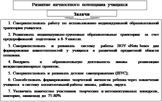 Все это позволяет выделить задачи, направленные на решение стратегических целей школы и достижения миссии учреждения с учетом имеющихся результатов.