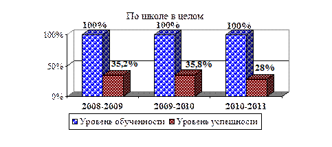 Результаты несколько хуже, чем в предшествующие годы. Это объясняется работой в 2010 – 2011 у.г. вновь пришедших учителей Булычева В.М., а также работой молодых специалистов Куклина В.С., Авраменко И.В., Ивашкевича А.В. (уч. обществознания), отсутствием у них методического и педагогического мастерства.