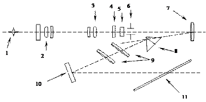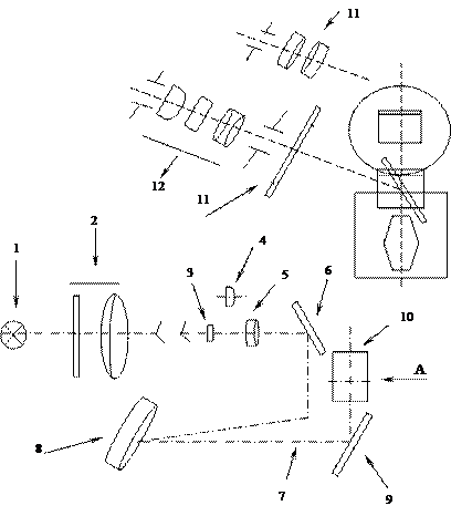Излучение от дугового или искрового разряда 1 с помощью трехлинзовой системы 3 и зеркал 6, 7 проектируется на дифракционную решетку 8. Линза 3 осветительной системы – сменная. При замене на линзу 4 источник проектируется вблизи щели, давая ее интенсивное освещение, обеспечивающее оптимальные условия анализа трудновозбудимых элементов.