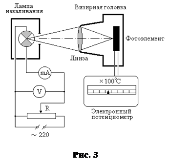 Температура вольфрамовой нити лампы накаливания измеряется с помощью фотоэлектрического пирометра, в визирной головке которого расположен чувствительный фотоэлемент. Для повышения точности измерений изображение раскаленной нити проецируется на фотоэлемент линзой. При освещении фотоэлемента в цепи его возникает электрический ток, пропорциональный световому потоку. Этот ток измеряется с помощью электронного потенциометра, отградуированного в °С.