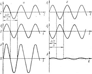 Взаимодействие когерентных волн: а - усиление волн б - ослабление волн