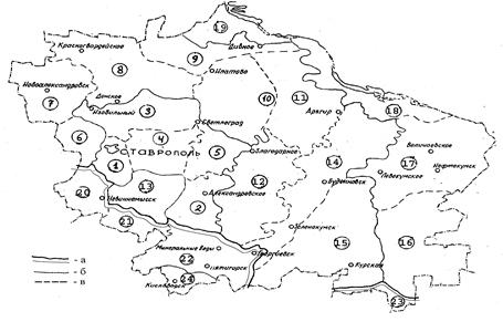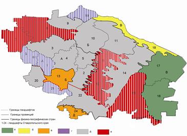 В Ставропольском крае выделяется 24 ландшафта, границы которых не совпадают с границами административных районов. В названиях ландшафтов отражено их современное состояние с учетом антропогенного воздействия на их биотические компоненты (рис. 2).