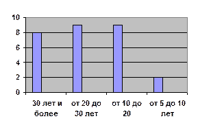 Стаж 30 лет и более имеют 8 человек, от 20 до 30 лет – 9 человек, от 10 до 20 – 9 человек, от 5 до 10 лет – 2 человека.