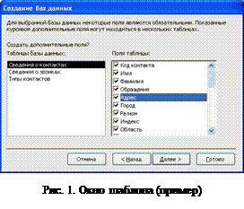 После запуска программы Microsoft Access шаблоны доступны справа экрана. В версии 2003 надо выбрать пункт «Создать файл», потом во вкладке «Шаблоны» - «На моем компьютере». Появится окно «Шаблоны», где выбирается вкладка «Базы данных». В зависимости от предметной области по варианту выбрать одно из названий БД: «Контакты», «Мероприятия» и др. Например, для предметной области «Студенты факультета» это «Контакты», так как там имеется фамилия, имя. Нажать кнопку «ОК», затем появится окно, где можно указать имя создаваемого файла. Выберите папку и введите имя файла, где будет сохраняться база. В следующем окне нажмите «Далее». То, что появится для шаблона «Контакты», показано на рис. 1. Здесь поставьте галочки против тех полей, которые перечислены в варианте, а если таких нет, наиболее соответствующих. Например, «биография» соответствует полю «заметки». В следующих двух окнах выберите вид оформления экрана и отчета, например, стандартный и деловой. Потом задайте произвольное название БД и нажмите «Готово». Через некоторое время запустится форма, и с БД можно работать.