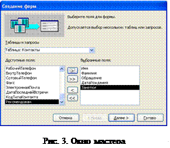 Перечисленные элементы находятся в «Вид», «Панель элементов». Для создания формы выберите окно (рис. 2) и нажмите «Формы». Затем выберите «Создание формы с помощью мастера» и следуйте указаниям мастера (рис. 3). А именно, выберите таблицу, куда форма будет вводить данные, и поля этой таблицы. Для выбора поля выделите его мышью и нажмите кнопку «стрелка вправо» (знак «больше»), при этом имя поля будет перенесено из левого в правый список. Для обратного переноса нажмите кнопку «стрелка влево». Для выбора всех полей нажмите кнопку «две стрелки вправо». В следующем окне выберите внешний вид формы, например, «В один столбец», затем выберите стиль и задайте имя формы. После нажатия «Готово» можно будет вводить данные с этой формой. Она уже содержит поля, метки и кнопки для перехода по записям.