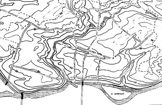 Верхний рисунок (по К.А.Меркуловой, 2006 г.): тонкие линии – горизон-тали, утолщенные – гидроизогипсы; точками показаны тальвеги балок. Нижний рисунок (по Хрусталеву Ю.Н. и др. 2001 г): горизонтали рельефа и основные транспортные магистрали.