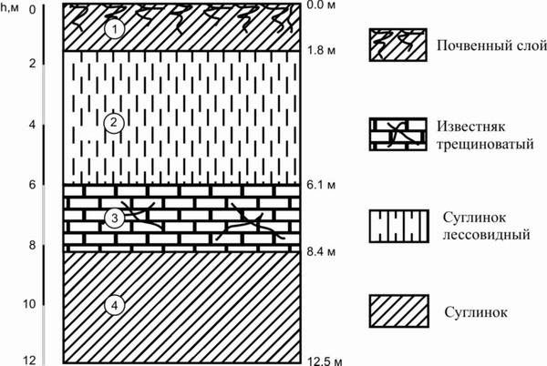 1 – суглинки макропористые; 2 –песок мелкозернистый; 3- известняк трещиноватый; 4- глины плотные; 5 – осыпь
