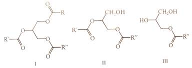 Наиболее важная и распространенная группа простых нейтральных липидов — ацилглицерины. Ацилглицерины (или глицериды) — это сложные эфиры глицерина и высших карбоновых кислот (См. Приложение 2). Они составляют основную массу липидов (иногда до 95%) и, по существу, именно их называют жирами или маслами. В состав жиров входят, главным образом, триацилглицерины (I), а также диацилглицерины (II) и моноацилглицерины (III):