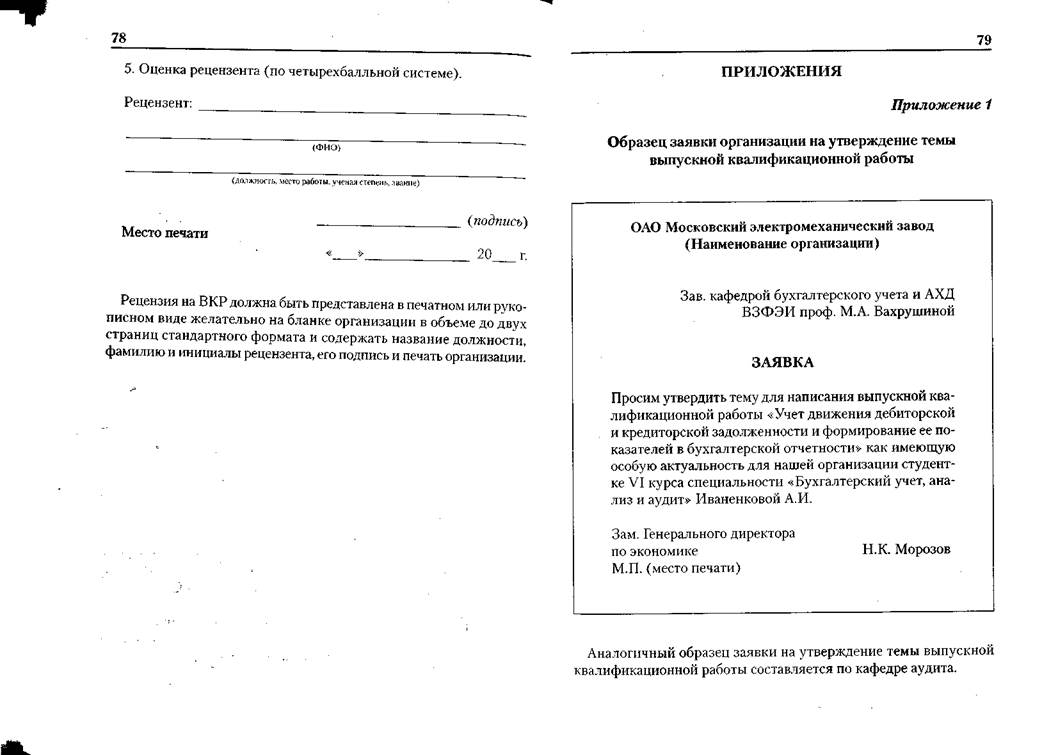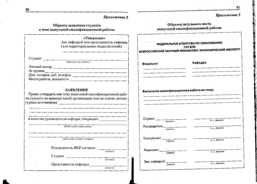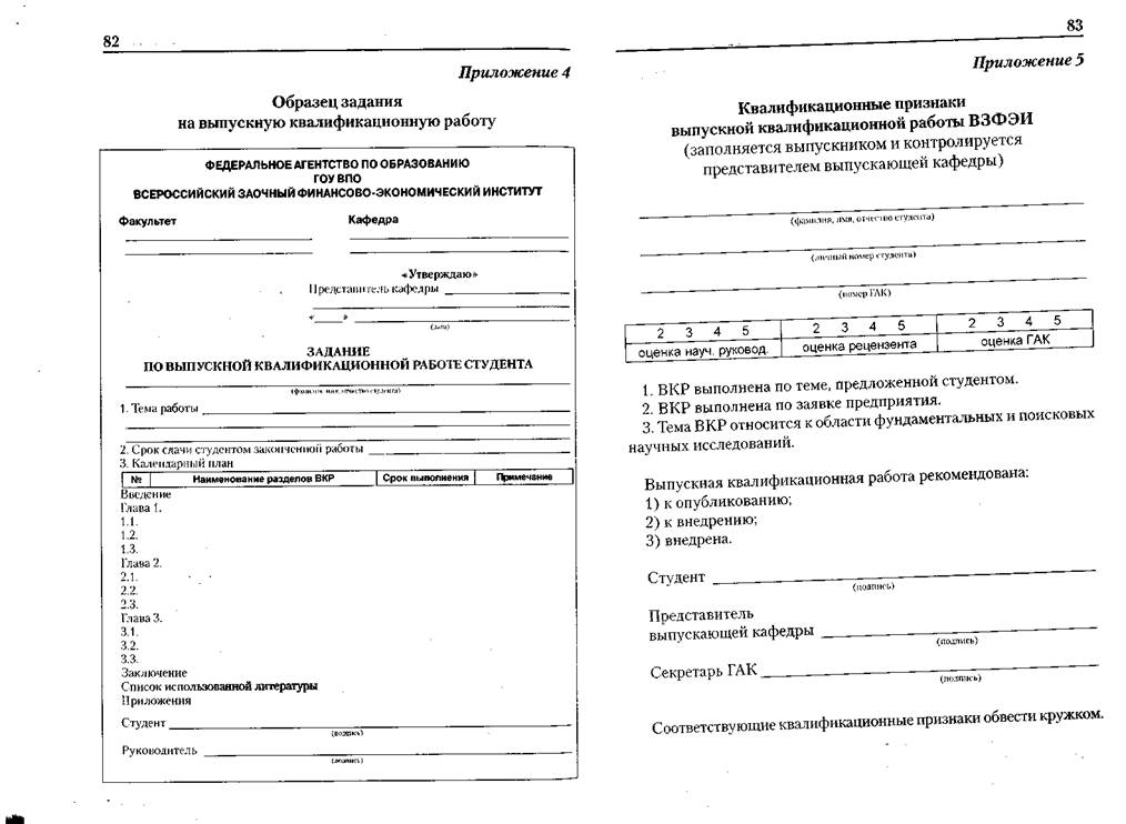 В приложениях содержатся образцы заявок организаций на утверждение темы выпускной квалификационной работы, заявления студента о теме ВКР, титульного листа ВКР, задания по ВКР, содержания ВКР, демонстрационного материала для выступления на защите.