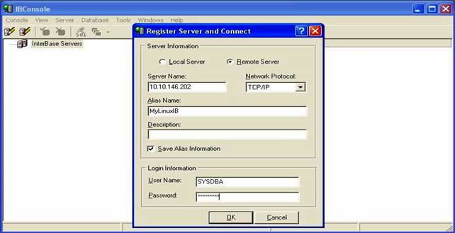 Первым шагом работы с программой является регистрация сервера Interbase, это можно сделать выбрав соответствующий инструмент на панели инструментов или через главное меню Server -> Register … . После этого открывается окно регистрации где нужно заполнить все поля. По умолчанию после инсталляции IntrerBase сервера регистрация возможна с именем SYDBA и паролем “masterkey”. Вид окна с заполненной формой показан на рис. 2.