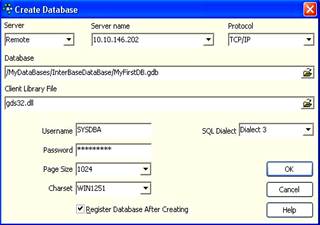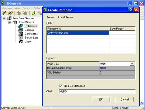 После успешного соединения с сервером доступны операции добавления/редактирования/удаления новых/старых пользователей, создание новой базы данных, регистрация на существующей базе данных. Создание новой базы данных можно выполнить из главного меню DataBase -> Create Database … . Пример заполнения формы при создании базы данных “MyFirstBD.gdb” показан на рис. 3.