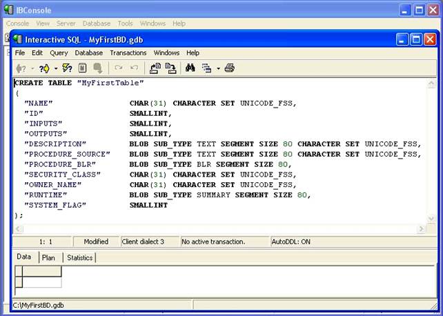 После создания базы данных возможно создание новых пользовательских таблиц. Для создания новой таблицы необходимо запустить “ISQL” и на верхней панели ввести текст в формате SQL открыть предварительно написанный для этой цели скрипт. На рис. 4 показан пример создания новой таблицы. Заполнение таблицы возможно после двойного щелчка на выбранной таблице из списка в окне “IBConsole”. Дальнейшая работа с программой не должна вызывать трудностей.