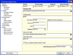 Настройка кодировки. Сервер InterBase позволяет определять кодировки в формате DOS и WN1251. Кроме того, имеется возможность настройки параметров сортировки и сравнения символов. Последнее важно, если вы собираетесь использовать в полях строчные и прописные буквы.