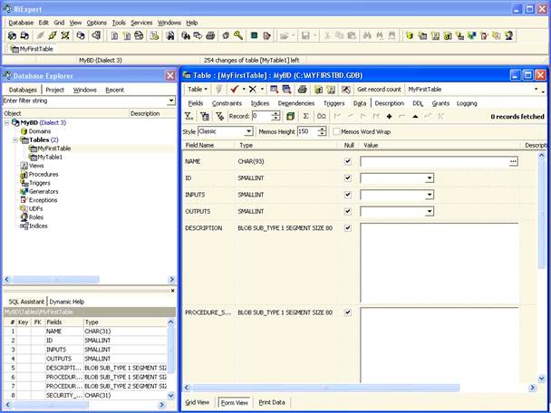 Программа “IBExpert” имеет гораздо больше возможностей по управлению базами данных. Наиболее существенным преимуществом по отношению к “IBConsole” является возможность заполнения и редактирования полей типа BLOB. После первого запуска программы открывается окно, которое показано на рис. 5. Первоначально доступны только две функции: регистрация базы данных – “Register Database” и создание базы данных – “Create Database”. Эти функции можно запустить из главного меню или из панели инструментов. При выборе функции “Create Database” нужно в открывшемся окне заполнить предложенную форму (рис. 6). При выборе функции “Register Database” нужно ввести данные для регистрации (рис. 7). Работа с программой достаточно проста и не требует специальных пояснений. Для примера на рис. 8 показано окно при редактировании таблицы MyFirstTable.