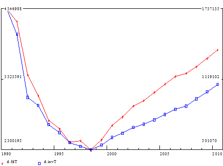 Известно, что для обеспечения сходимости в модели необходимо тесно связать расчеты конечного спроса и выпусков в реальном блоке с расчетами добавленной стоимости и цен в номинальном блоке. В частности, если мы имеем в модели функцию заработной платы в расчете на одного занятого, эта связь обычно обеспечивается посредством функций занятости и производительности труда. Однако не сразу ясно, что делать в случае, когда почти двукратному уменьшению выпуска продукции за 1990-1997 гг. соответствует лишь 13-процентное сокращение занятости. Формально это означает, что производительность труда (выпуск на одного занятого) за тот же самый период упала до 58% по сравнению с уровнем 1990 г. Нам не удалось пока построить удовлетворительных функций отраслевой производительности труда, описывающих этот процесс. Поэтому в сегодняшней версии модели отсутствует в явном виде уравнение для производительности труда, а занятость связывается соотношением обратным функции Кобба–Дугласа с отраслевыми выпусками и основным капиталом. Процесс спада производительности труда происходил на фоне огромного роста номинальной заработной платы на одного занятого. Это обстоятельство затрудняет построение функций для заработной платы.