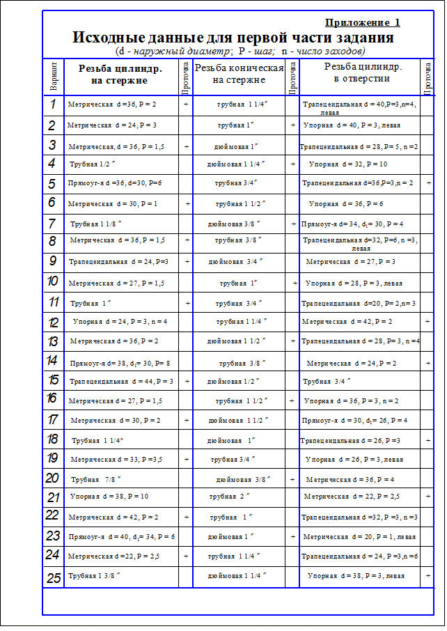 Резьбовые соединения встречаются в большинстве конструкций, поэтому грамотный специалист, не пользуясь справочной литературой, должен уметь правильно изображать, составлять и расшифровывать обозначение любой резьбы, а в будущем и назначать её, сделав предварительные расчёты.