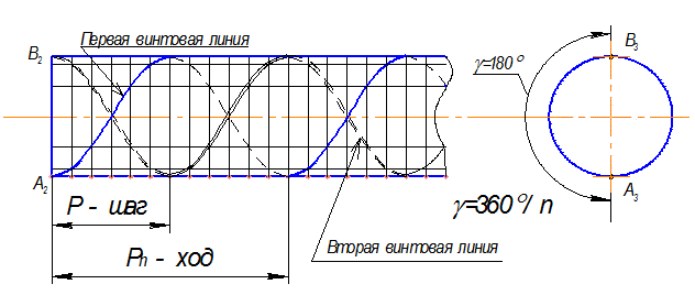 Если по поверхности одновременно в том же направлении и с тем же шагом перемещаются две, три, n равномерно расположенные точки, то получается двух-, трёх-, n - заходная винтовая линия. В этом случае расстояние, на которое перемещается точка одной и той же винтовой линии за один полный оборот, называется ходом P