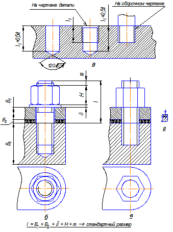 вычерчиваем упрощенно. Размеры крепёжных деталей с целью отработки навыков в пользовании справочной литературой выбираем из таблиц соответствующих стандартов. Длина шпильки рассчитывается аналогично длине болта, затем также округляется до ближайшей большей стандартной длины, по этому же стандарту определяется и длина нарезанной части l0