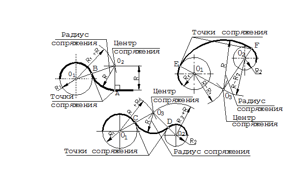 Точка сопряжения лежит на перпендикуляре, опущенном из центра дуги на сопрягаемую прямую (точка А) или на линии, соединяющей центры сопрягаемых дуг (точки В, С, D, Е, F).