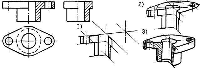 Задана фигура, представляющая собой сложное тело, ограниченное несколькими поверхностями. Линия сечения фигуры заданной плоскостью состоит из отдельных ли- ний пересечения этой плоскости с каждой из поверхностей. Строить проекции линии сечения надо последовательно: сначала построить линию пересечения плоскости с одной поверхностью, затем - с другой и т.д. Например, сначала построить линию