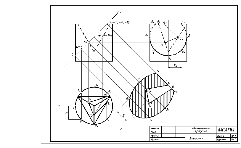 Таким же образом построить проекции точек на пирамиде (8-11). Соединить полученные точки, обвести толстой линией и заштриховать сечение под углом 45° к оси Х1