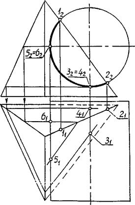 пендикулярна фронтальной плоскости (цилиндр фронтально проецирующий и весь проецируется в окружность), поэтому фронтальная проекция линии пересечения цилиндра и пирамиды совпадает с частью окружности,в кото- которую проецируется цилиндр. Эту часть сразу можно обвести толстой красной линией. Горизонтальные проекции точек, принадлежащих линии пересечения, находят из условия принадлежности их поверхности пирами- ды. Опорные точки линии пересечения:1 и 2 - точки пересечения ребра пирамиды с цилиндром (точки излома линии пересечения) – очевидные(оп-ределяются проведением линии связи); 3 и 4 - точки пересечения нижней образующей цилиндра с гранями пирамиды; 5 и 6 - точки пересечения го- ризонтальной очерковой образующей цилиндра с пирамидой (в этих точках меняется видимость горизонтальной проекции линии пересечения).