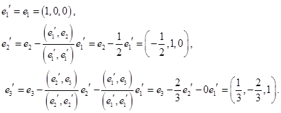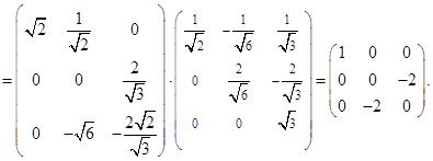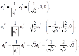 имеет три корня , которым соответствуют следующие собственные вектора: . Они являются попарно ортогональными, так как соответствуют разным собственным значениям, и образуют собственный ортогональный базис. Осталось его пронормировать: