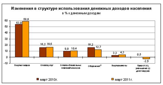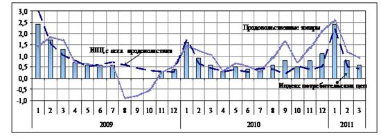 составила 3,8% (годом ранее – 3,2%), в т.ч. в марте она составила 0,6% (0,8% в феврале), после 2,4% в январе (см. рис.1). В годовом выражении по состоянию на март 2011 г. инфляция составила, как и в феврале, 9,5% (в январе – 9,6%). Главным фактором замедления инфляции стало существенное снижение темпов роста цен на продовольственные товары, на что, по оценке Минэкономразвития, повлияли меры Правительства Российской Федерации по насыщению продовольственных рынков (обнуление ввозных пошлин на картофель и овощи, и ряд других товаров, зерновые интервенции и др.).
