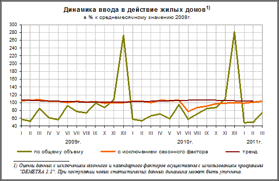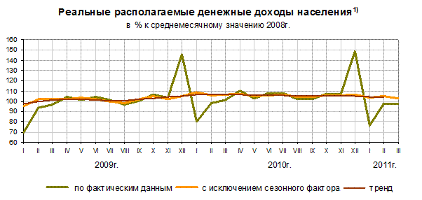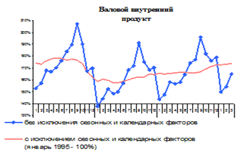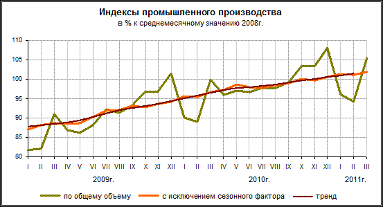 вырос на 4,5% к соответствующему периоду прошлого года (рост в I квартале 2010 года составил 0,6%) (см. рис.2). В I квартале текущего года рост ВВП с исключением сезонного фактора по отношению к предыдущему кварталу замедлился до 1,3% по сравнению с 2,8% в IV квартале 2010 года. Сказалось значительное снижение инвестиционного спроса в январе текущего года и, хотя в феврале и марте уже отмечался рост динамики данного показателя, в целом за квартал инвестиции внесли сильно отрицательный вклад в развитие экономики. Рост ВВП в I квартале базировался, прежде всего, на росте потребительских расходов и на усилении накопления запасов.